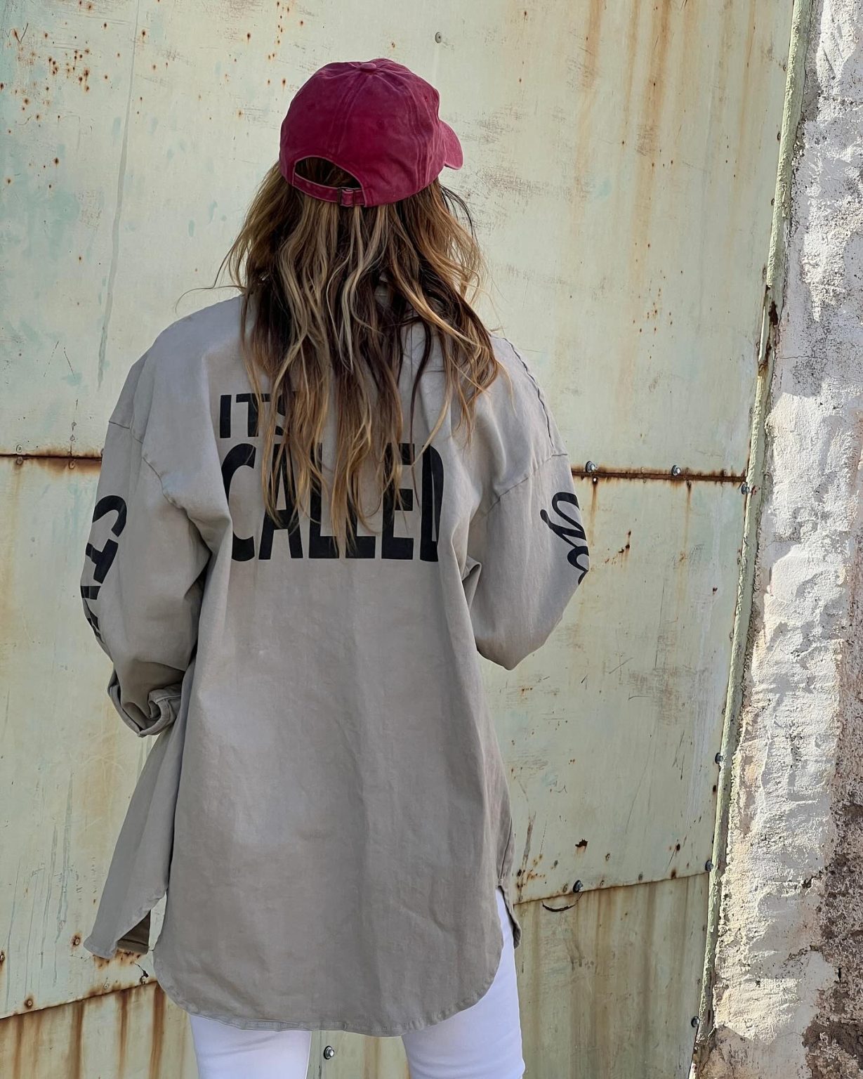 Una gorra de lona granate con el logotipo HIPPIE FISH pintado a mano en blanco en una medida para chicas.